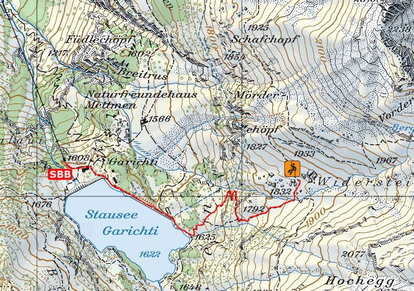 Vom Bahnhof Schwanden mit dem Bus 53..67 durch direkt nach Kies (Niederental). Von dort mit der Seilbahn hoch zum Garichtistausee. (Betriebszeiten Seilbahn siehe Anfahrt Auto). Vorsicht die Seilbahn fährt deutlich länger wie die Busverbindungen nach Schwanden bestehen, im Sommer fährt der letzte Bus Richtung Schwanden um 17.40. Auf der Mettmenalp gibt es jedoch Übernachtungsmöglichkeiten.
