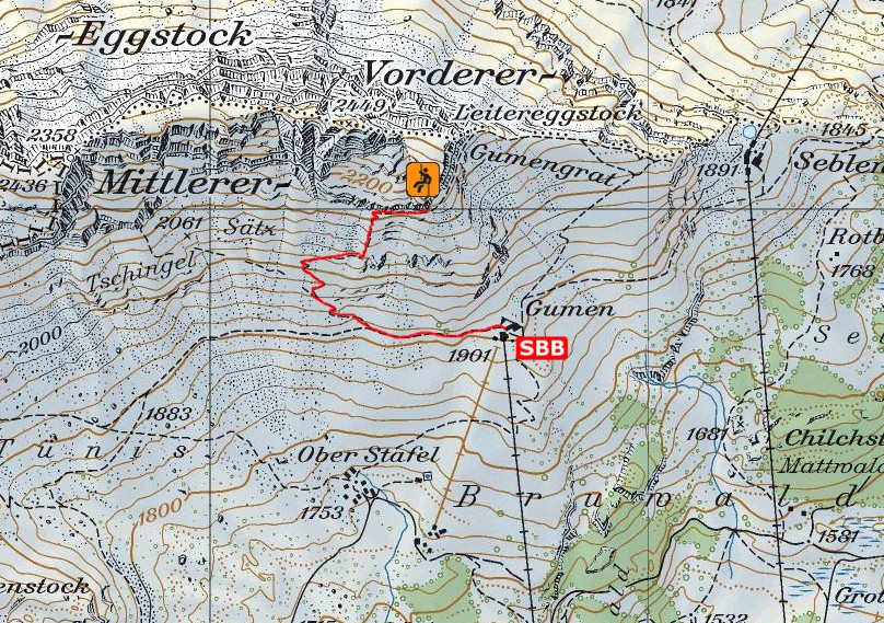 Ab Ziegelbrücke weiter mit dem Regionalzug Richtung Linthal bis Haltestelle Linthal-Braunwaldbahn. Umsteigen in die Standseilbahn nach Braunwald und mit dem Sessellift nach Gumen. Von Gumen Berggasthaus erreicht man den Klettergarten über den Rundweg Gumen-Gumengrat-Klettergarten-Gumen.