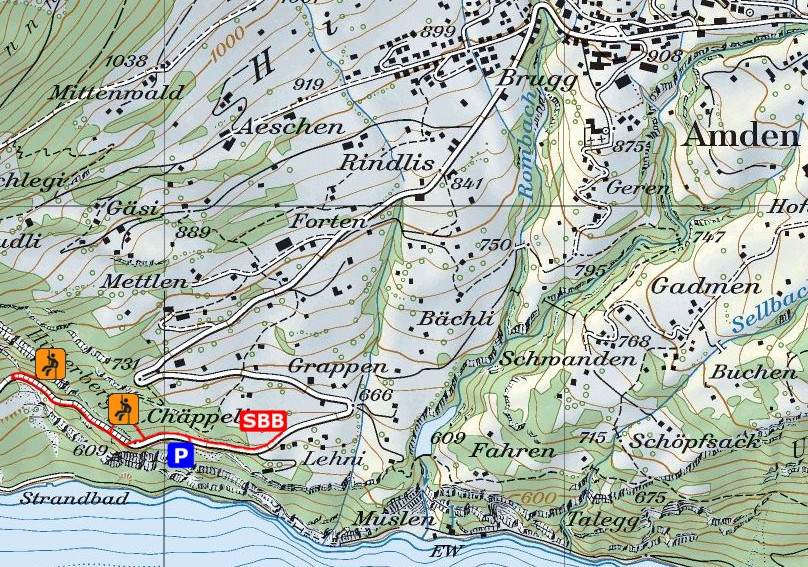 Ab Weesen der Strasse hoch nach Amden folgen. 100 Meter nach der ersten Galerie stehen links und rechts Parkplätze zur Verfügung. Falls besetzt, weiter oben in der Spitzkurve parkieren.