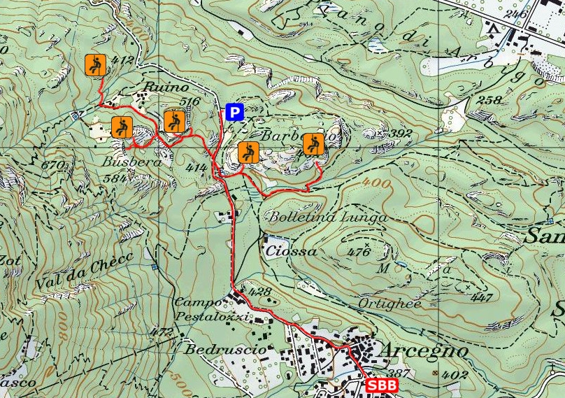 Ab Locarno in Richtung Losone und dann Arcegno halten. Im Dorf selber der Via E. Pestallozzi ca. 1.5km folgen. Parkplätze stehen auf beiden Strassenseiten zur Verfügung.